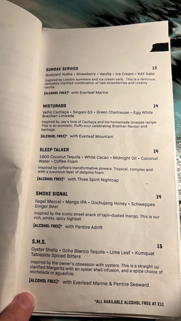 Our waitress, Olivia, expertly guides us by our decisions, my first of which, S.M.S. is impressed by the proprietor’s obsession with oysters, Described as a clarified Margarita it is also a Tequila Martini. The oyster style is delicate to the purpose of being non-existent but it surely’s an appealingly pure cocktail with a recent, see by look and no frills in its presentation. It’s candy with a barely bitter undertone. My good friend’s Piña Noir is a recent tackle the Piña Colada which was the proprietor’s mum’s favorite vacation sup. Structured round home made tapacha (fermented pineapple), it’s one other pure drink, is mild, loads much less stodgy and wealthy than its inspiration and has a fling of desiccated coconut adorning the outside glass. It elicits pleased phrases. ’Wow! That’s superb! Wow once more!”