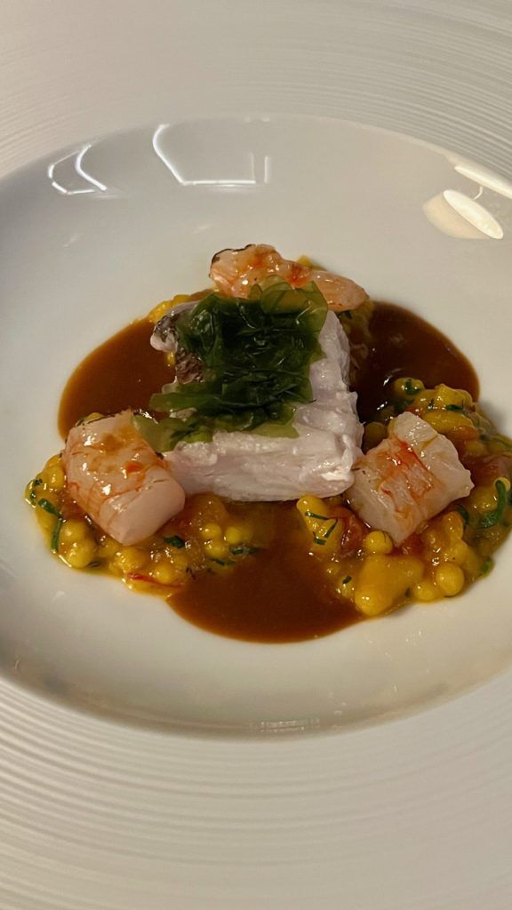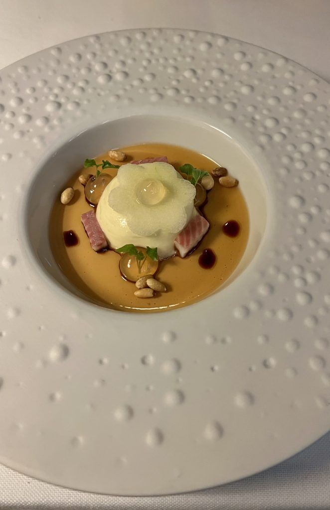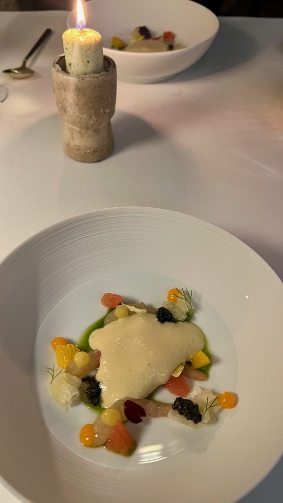 ‘Candlelight’ is because it sounds. Nevertheless, the candle isn’t product of wax however butter with garlic and specks of parsley. The wick burns, the arduous butter melts. It’s served with sourdough stuffed with pine nuts and is all so moreish that we undergo two candles. ‘A Sin in a Spoon’ is a small bowl of foie gras embellished with star formed granny smith apple, muscat gel and elderflower gel. Foie Gras errs extra in the direction of the comfortable than the strong so a spoon is certainly to ensure that a sloppy and lavish combine. ‘A Conflict of temperatures’ consists of uncooked Algarve prawns, extra caviar, grapefruit and orange segments, all of that are lined in a heat leek foam on the desk for an train in contrasts.