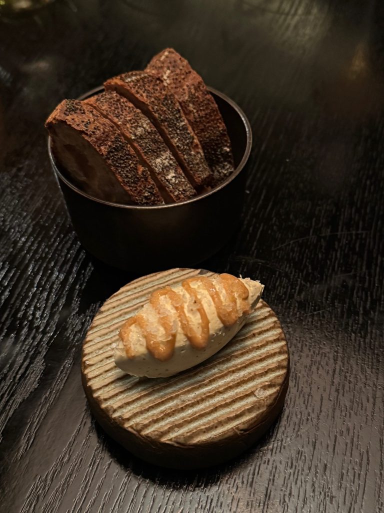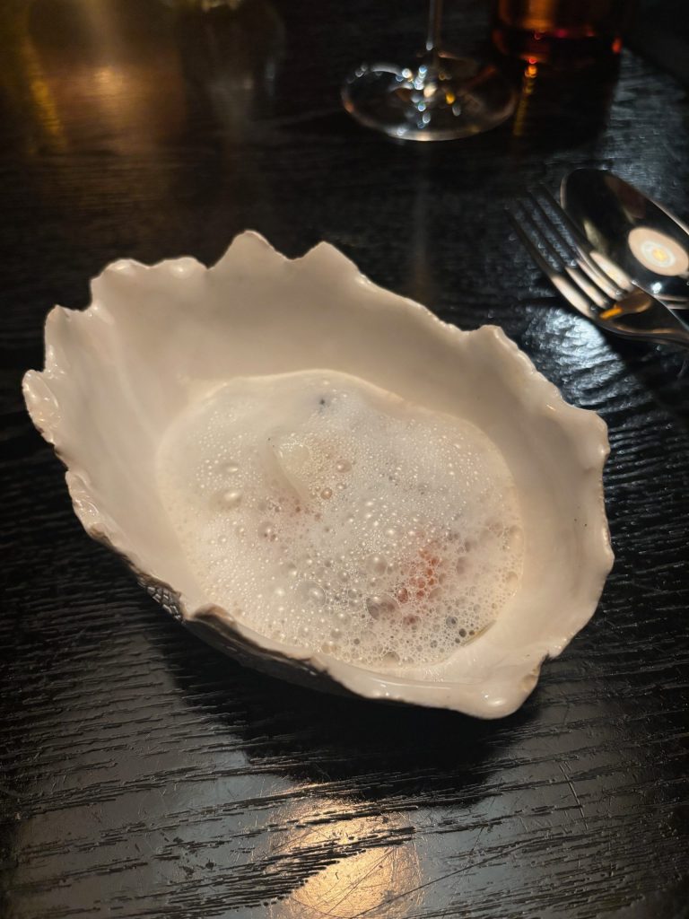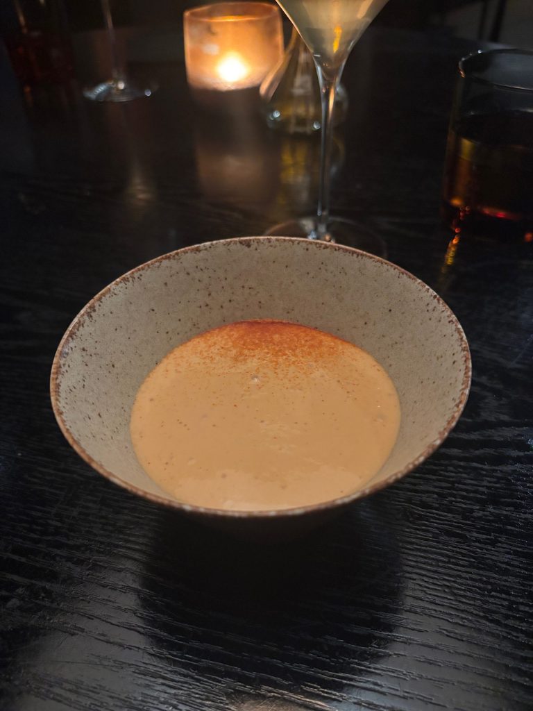We start the journey with a light-weight pumpkin soup served in a stone vessel. It’s salty, barely candy and scrumptious. I battle to detect pumpkin, however an umami component is unquestionably current. The soup is made with oil infused with lovage and a splash is added to the highest to create the enjoyable color separation. We’re off to a wonderful begin!!