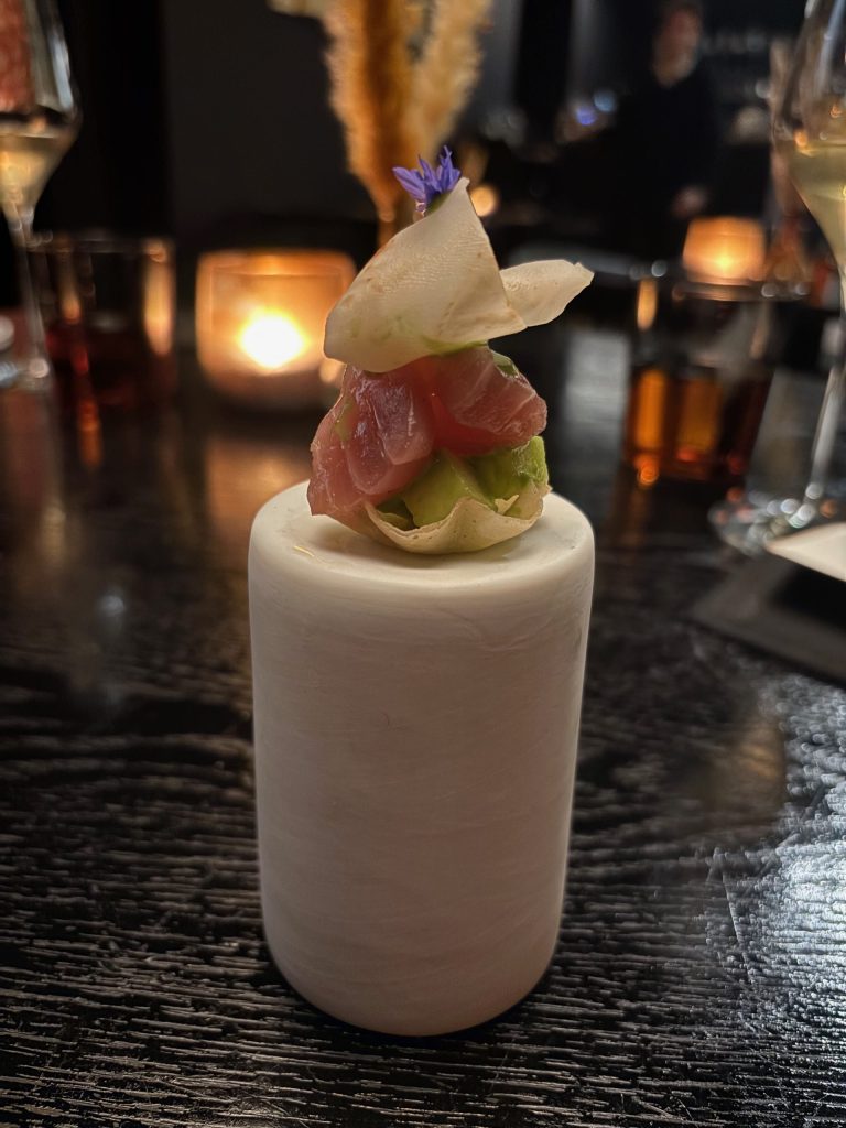 The subsequent dish is sort of too stunning to deconstruct. Standing on a sturdy stone pillar sits a fragile creation that’s nearly butterfly-esque. The star of the present is yellow fish tuna complemented by Fermented celeriac and crunchy Granny Smith apple. I attempt to savour this in two fairly clumsy bites and rescue the second earlier than dropping it to the ground. I’m so happy I did – this mixture of soppy fleshy tuna with the tart apple and earthy celeriac is totally divine.