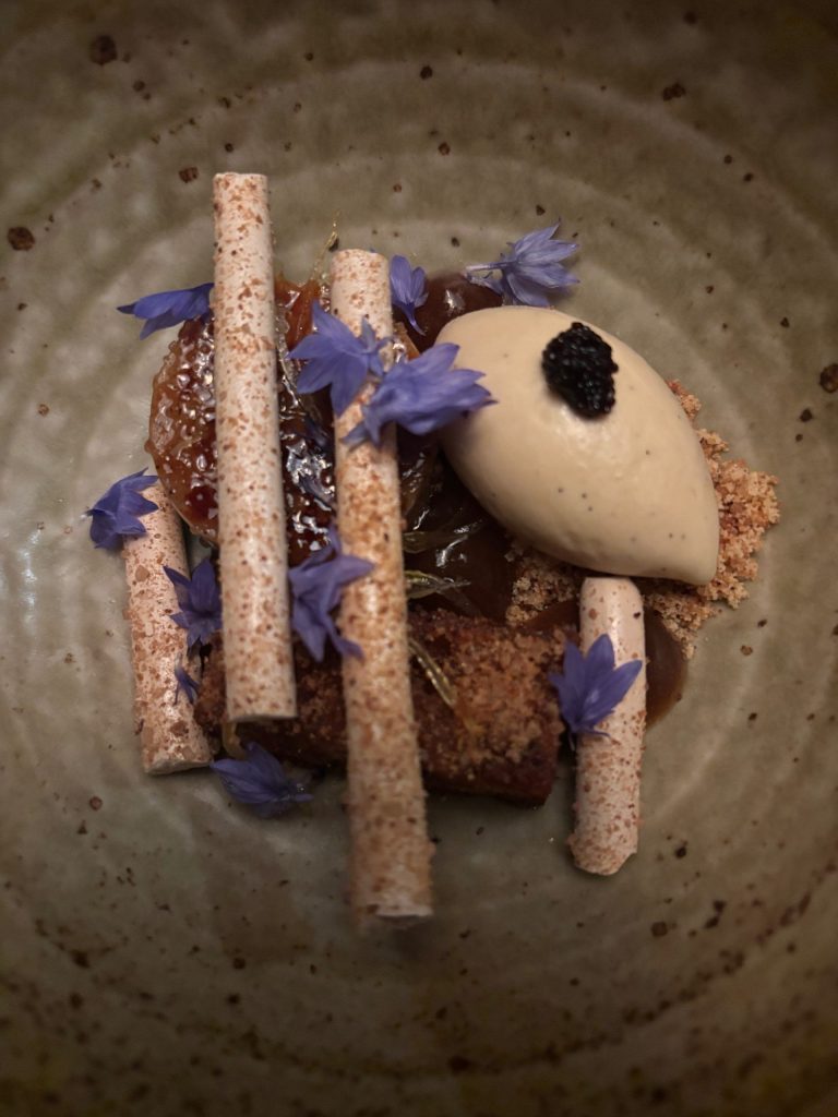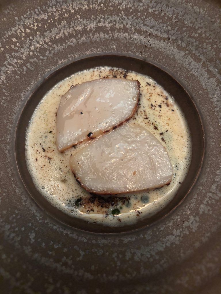 Persevering with the sea-faring theme, succulent scallops are subsequent on the menu served in creamy, barely salty sauce with a contact of zing from lemongrass. Fermented leek bulbs, which look a bit like inexperienced lentils, add nice texture to the dish. We be taught that the leek bulbs are fermented on the finish of their season to allow them to be used later all year long. I’ve by no means tried these earlier than however totally loved this dish, it’s my buddy’s favorite (once more – thus far!!)