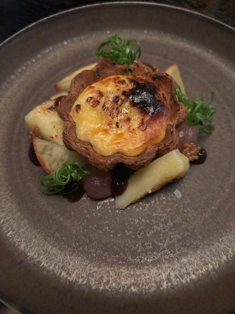 Just like the Lobster, the cheese course is served as a part of the ‘Full Cardinal Expertise’ and though I’m not a cheese lover, I resolve to provide it a strive – inspired by my cheese-fiend buddy who thinks he’ll get my leftovers. This description is maybe probably the most understated description on your entire menu. Impressed by a Portuguese Pastel ’de Nata. A crisp and butter pastry encases a heat, comfortable and creamy Isle of Mull Cheddar ‘custard’ befriended by candy and tangy pickled pearl onions, slices of tart Gala apple, barbeque cheese wedges, pickled mustard seeds, candy apple cider chutney all completed with hanging inexperienced chive ribbons. For sure, there weren’t any leftovers!