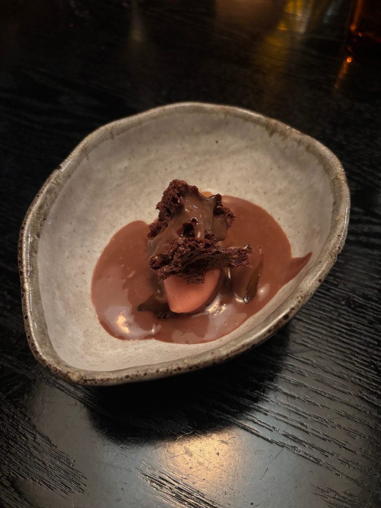 Heat, velvety chocolate sauce is poured from a stone jug over the chocolate creation which is wealthy and indulgent but because it’s produced from aerated chocolate isn’t sickly within the slightest. It jogs my memory of an extravagant and really decadent ‘Flake. It’s served with quince sorbet flavoured with cinnamon and seasonal spices. Crunchy cocoa nibs add distinction to the feel. It’s heavenly. Extra sir, please can I’ve some extra!!