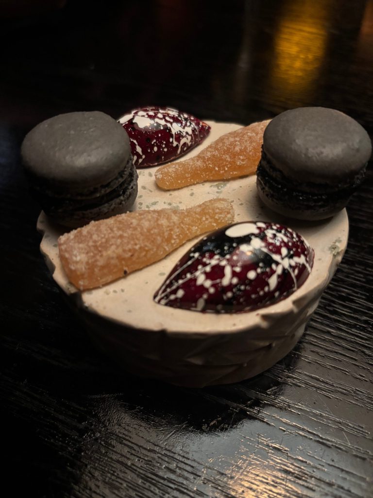 The present’s not over but. Though we each decline a espresso, we’re served a trio every of petit fours that are poised tantalising on one other sturdy stone pedestal. Regardless of being fairly full and nonetheless delighting in what we’ve simply skilled it could be impolite to not end the crystalised jelly, crisp and chewy macaroon and oozing caramel treats. Thanks.