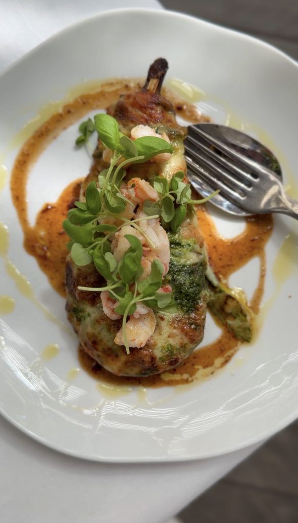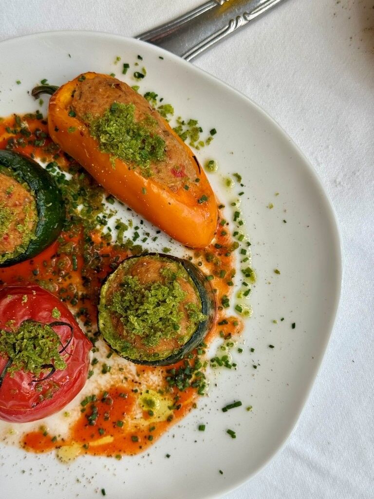 Aubergine with gambas and mozzarella was beneficiant and rustic in fashion. The petits farcis, courgette, tomato and child peppers, arrived wearing persillade crumbs and slightly tomato sauce. So good! The ocean bass carpaccio wore a salsa verde of capers, cornichons, mustard, herbs and white balsamic. Excellent with the Tomatina cocktail.