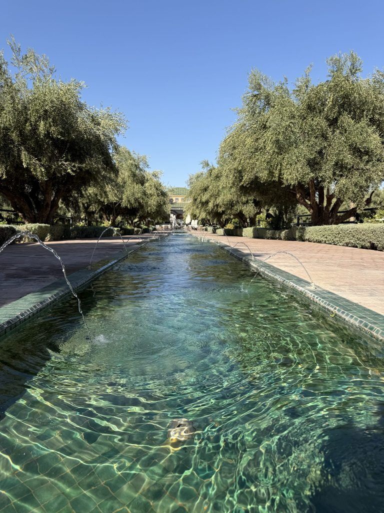 Arriving for lunch we go by the decadently furnished entrance salon and step out onto the elevated terrace. There’s a fountain on the centre, whereas the shaded tables are wearing white linen with elegant ceramics. Past the terrace balustrade the lengthy pool attracts a cool line by the gardens in direction of the Andalusian Pavilion. The suited headwaiter greets us and takes us to our desk.