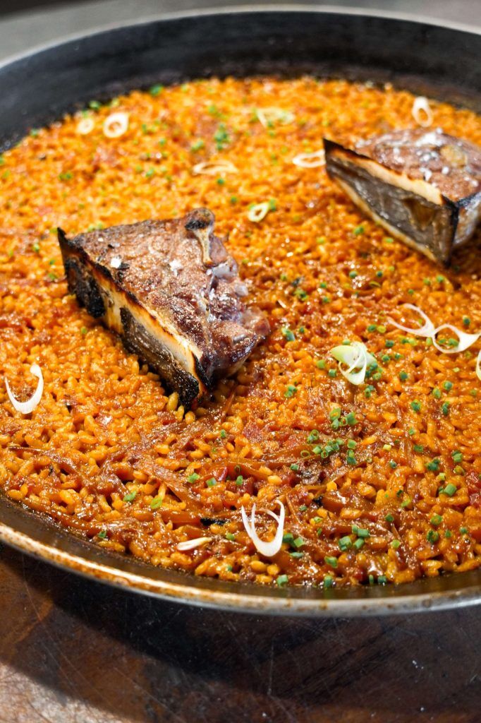 The menu opens with relaxed starters designed to move round: jamón ibérico croquettes with tomato alioli, and confit artichokes and leeks with Payoyo cheese and romesco. The centrepiece is rice cooked to order, with 5 decisions: Campero, Fish & Seafood, Black, Blended or Vegetarian. A home made dessert closes the meal on a candy observe.