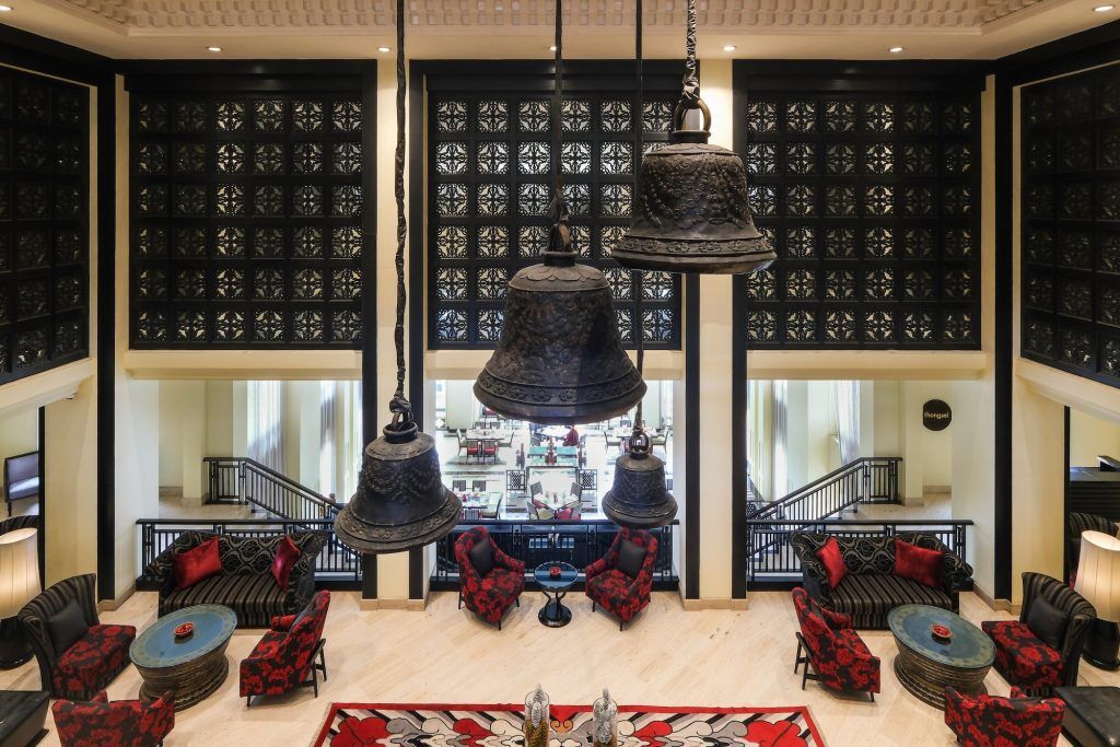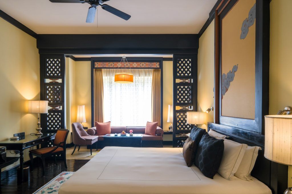 The 66 rooms and suites are embellished with conventional Bhutanese influences, with hand-painted murals, religious motifs, conventional woodwork, luxurious marble loos, and excessive ceilings that give a sense of area.