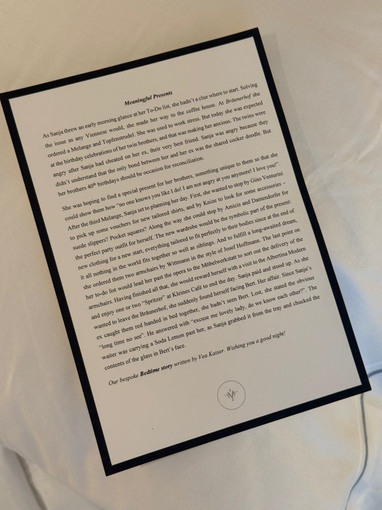 The small print stored revealing themselves. Just like the artwork and design board video games made solely for Rosewood Vienna, and our pillowcases embroidered with our initials. At turndown, my iPhone charger cable had been tidied with a bespoke leather-based cable tie, and left on the mattress was a enjoyable little nighttime story that cleverly impressed a metropolis itinerary for the next day.