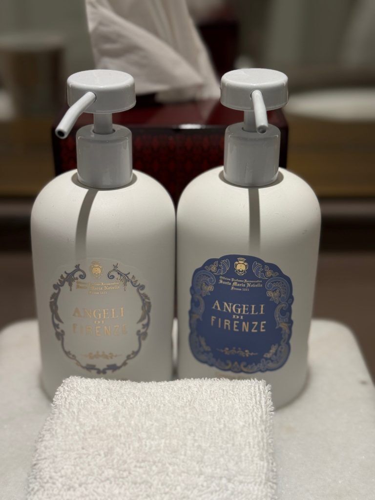 Within the wardrobe considerate touches like picket shoe bushes, whereas within the lavatory there have been sustainably sourced amenity gadgets like bamboo combs and toothbrushes, a pure loofah for the bathe, and Angeli di Firenze facilities in elegant porcelain dispensers.