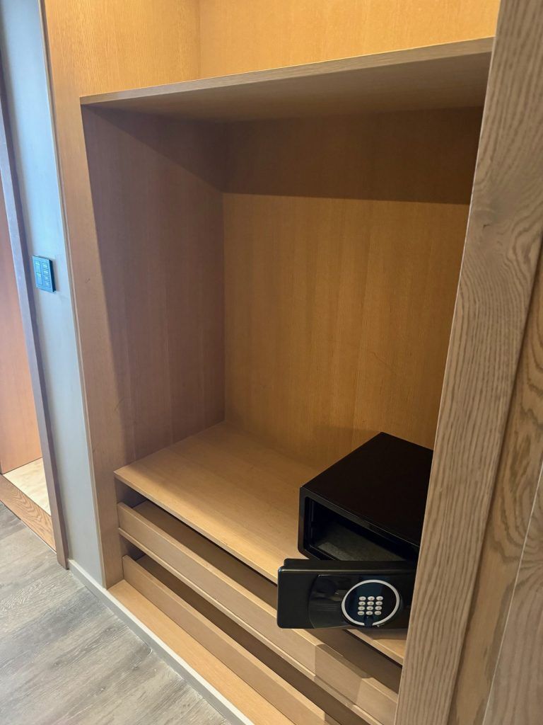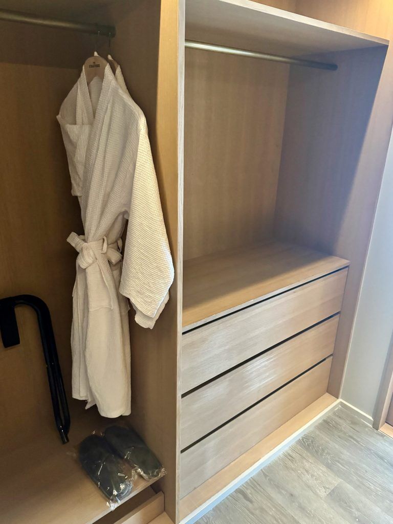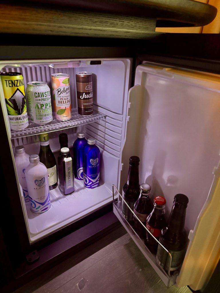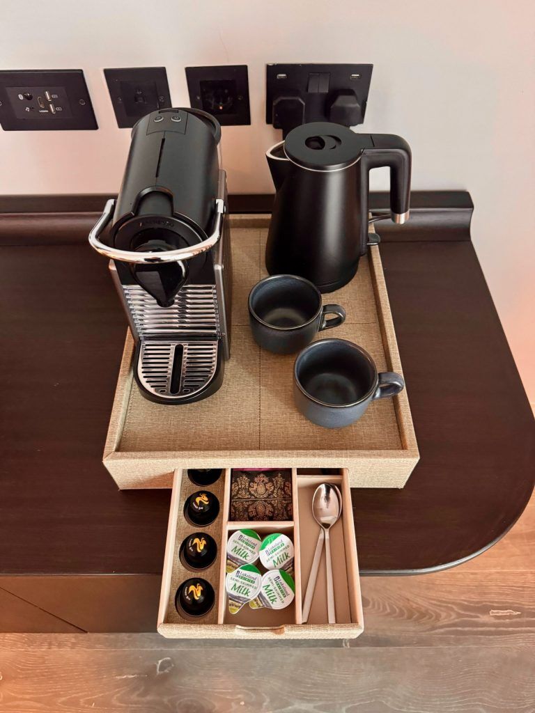 A protracted, dark-wood sideboard runs beneath the wall-mounted TV. One finish hosts a neat in-room espresso and tea station with a Nespresso machine and a kettle, whereas beneath, the minibar is stocked with native and worldwide comfortable drinks and alcohol.