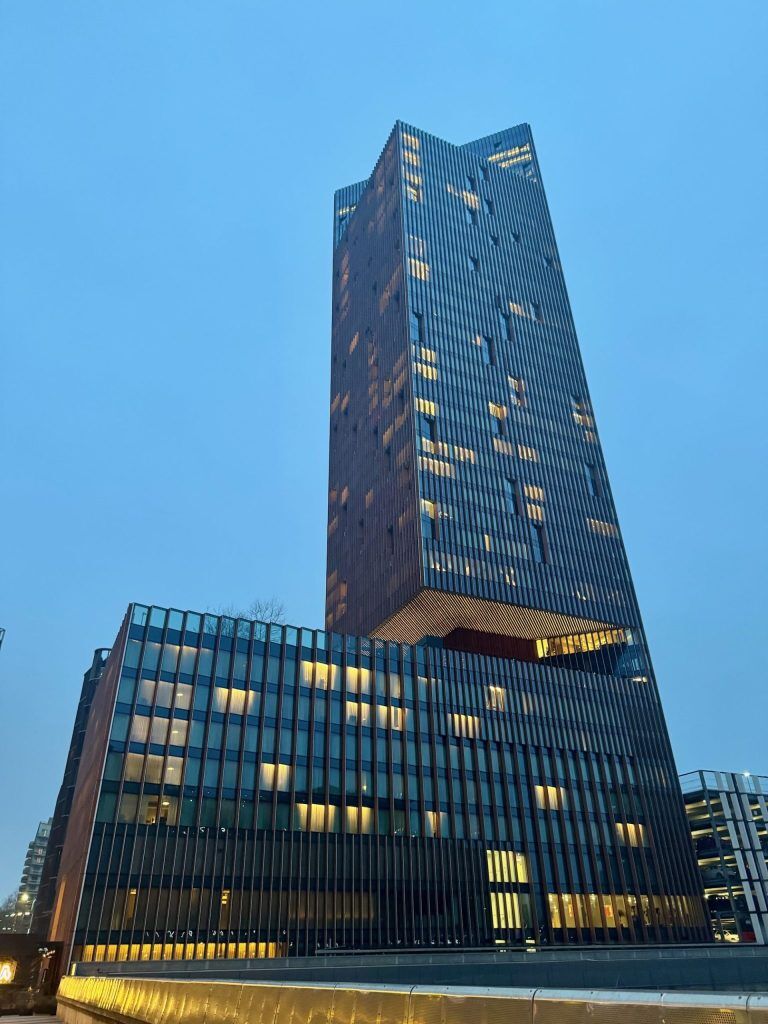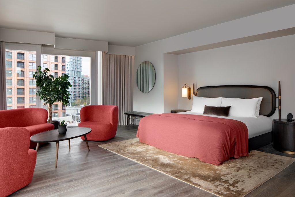 Throughout my keep, I used to be hosted in a Manhattan Studio, the lodge’s largest room class. A brilliant king mattress sits within the centre of this huge 64 sqm house, whereas purple tub armchairs and a curved couch lend a pop of color and character, together with a separate eating space. Home windows wrap across the nook of the room in a zig-zag formation, including architectural curiosity, whereas the angular structure additional enhances the views throughout Stratford’s skyline.
