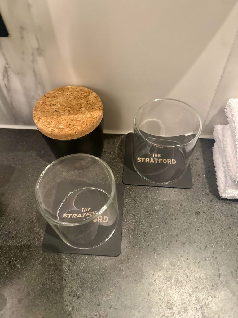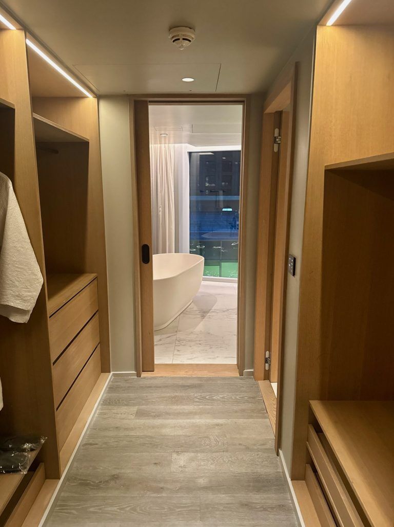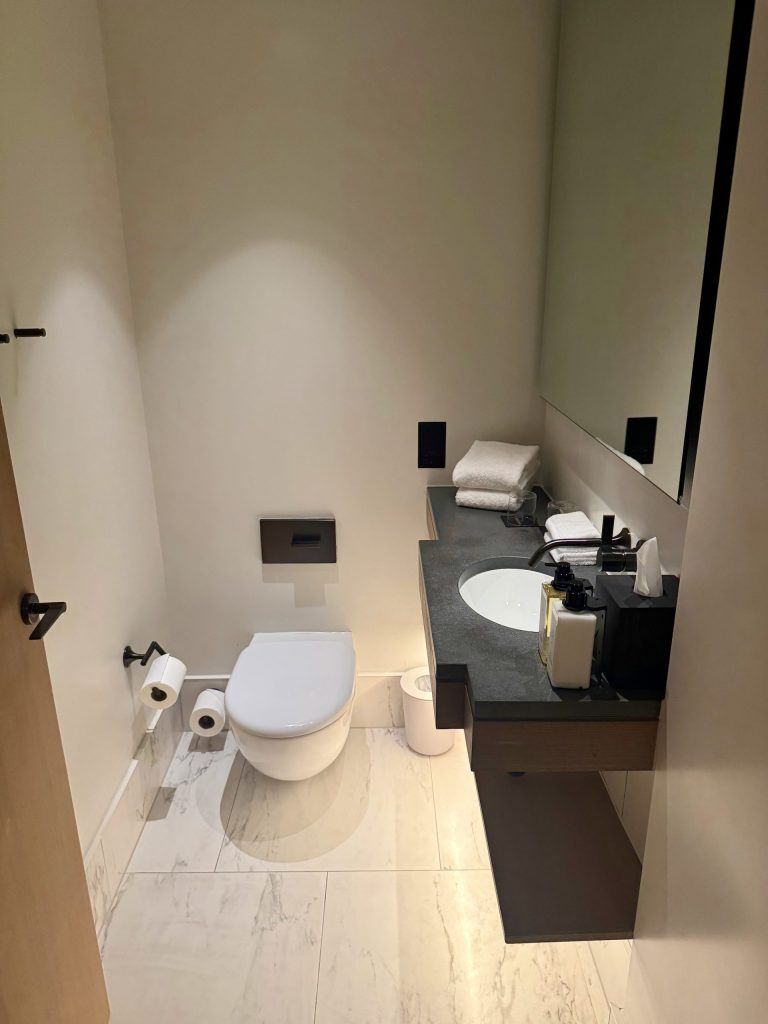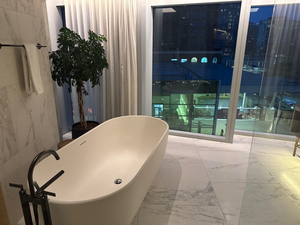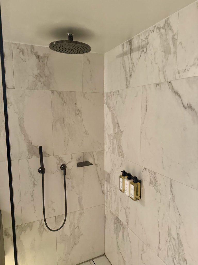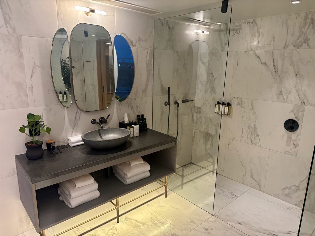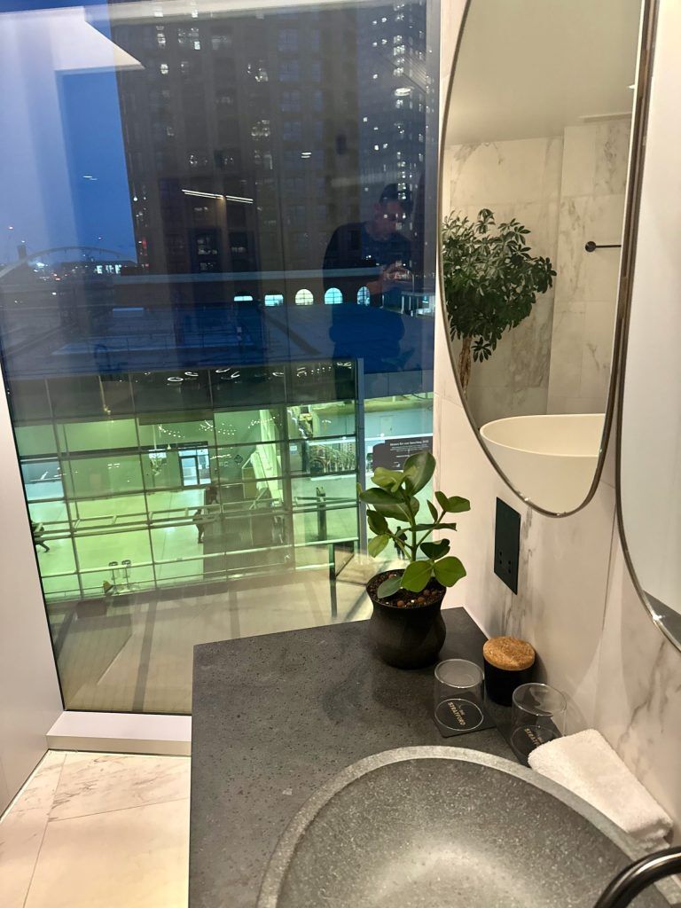 The lavatory is a sanctuary in its personal proper, encased in easy marble, with comfortable flooring and ceiling lighting. A sculptural freestanding bathtub is positioned by the window, which appears down on Stratford Worldwide Station. Throughout from the tub, is a big glass-sided rainfall bathe and a glossy vainness space. Simply bear in mind, the home windows aren’t one-way, so for added privateness, you should definitely draw the mesh curtains earlier than sinking into the bathtub… 😉