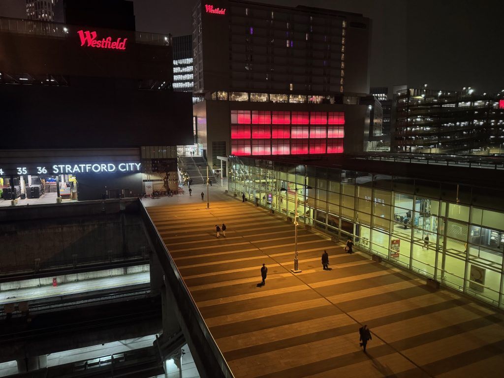 As day turned to nighttime, the view turns into cinematic because the neon from Stratford’s illuminated walkways and buildings glowed into the room.