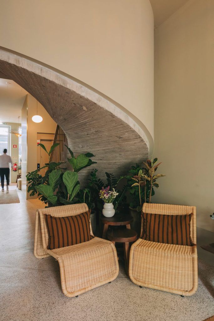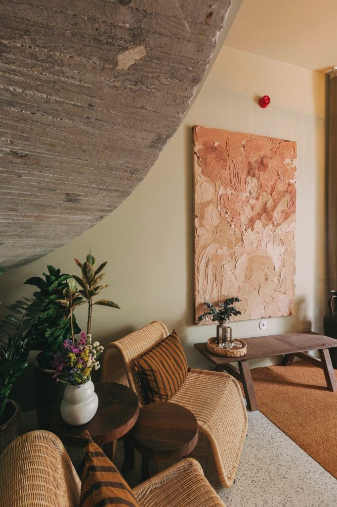 Renovation began in 2020, and its idea was to maintain authentic options however give the premises a up to date and pure twist. Actually, the uncovered concrete in the primary constructing achieves this, reminding us much less of brutalism and, particularly with cord-woven chairs and what may very well be milkmaid stalls, extra of a Nordic slickness. On the bottom flooring, a compact fitness center affords loads of train choices, together with weights, rowing and biking machines.