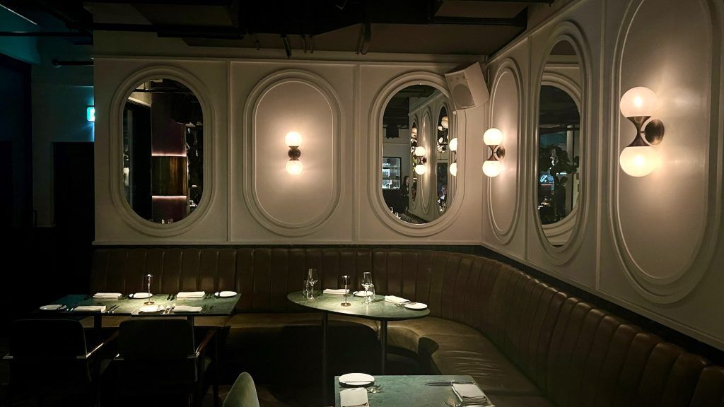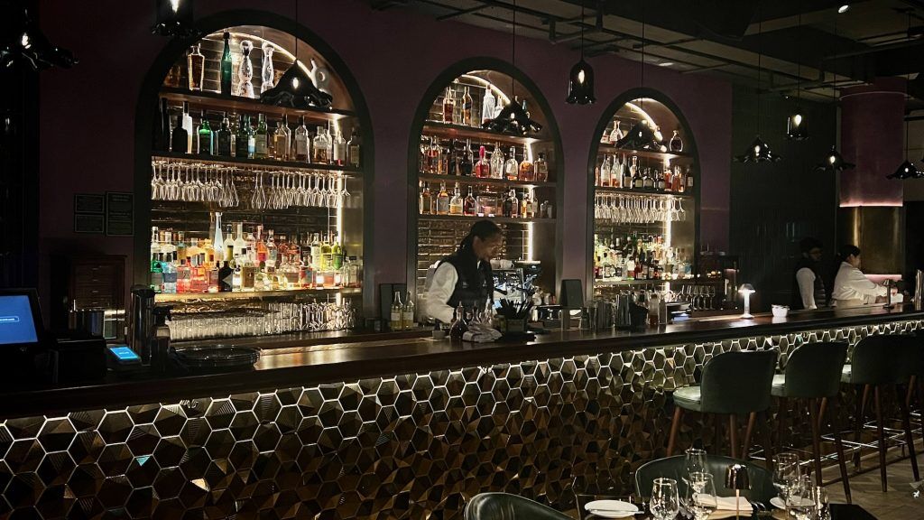 Inside, the rectangular restaurant could be very a lot open and welcomes with an affectionate metaphorical embrace. All darkish woods and curved, leather-bound chairs, it’s a comfy affair with dusky and atmospheric lighting, a mix of pinpricks on the far finish and subtle and hazy clusterings within the center. Three arches behind the bar on the fitting showcase an array of vibrant bottles which carry the house’s in any other case monochromatic aesthetic. A clubby backbeat is current however sufficiently low-key to make it unobtrusive.